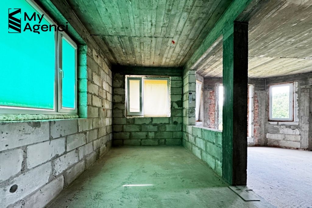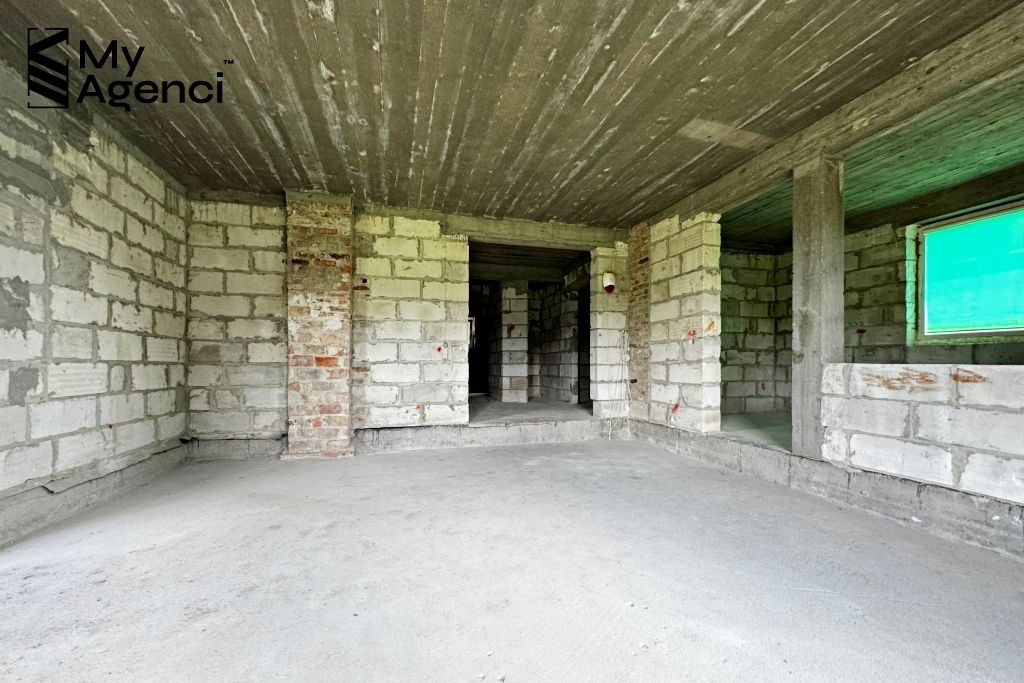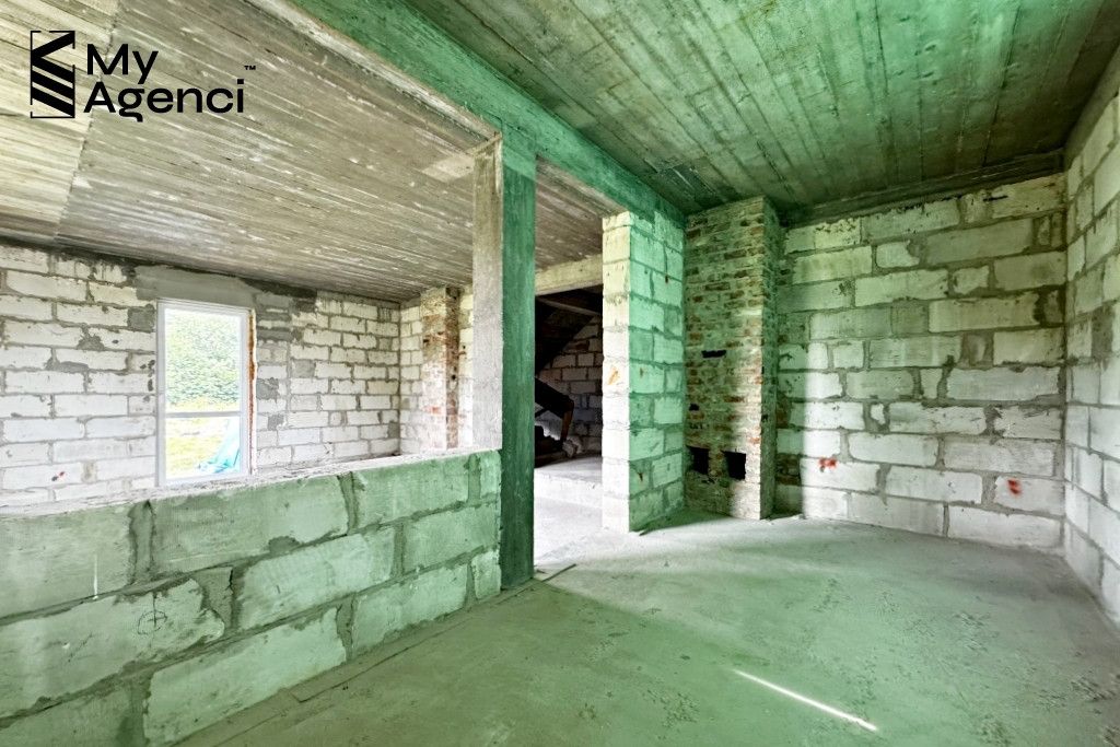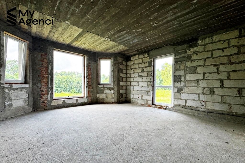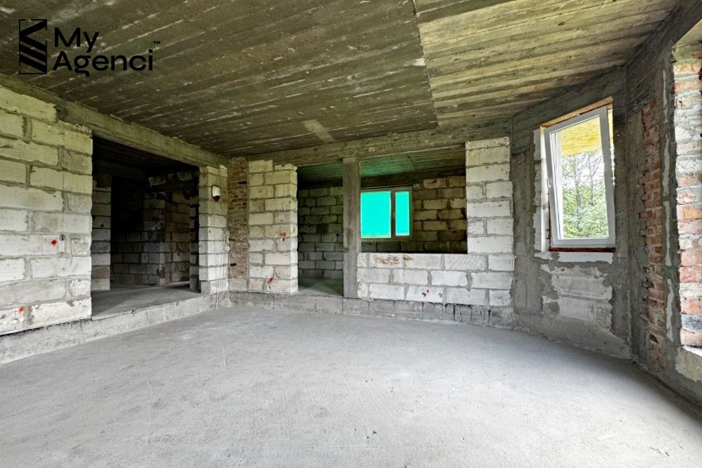 Dom usytuowany jest na działce o powierzchni 4 102 m2. Budynek jest w trakcie budowy (pozwolenie z 2006 r.), dziennik budowy jest uzupełniony o wpisy z bieżących prac. Dom cechuje się prostą, minimalistyczną bryłą - jest parterowym jednorodzinnym wolnostojącym budynkiem z użytkowym poddaszem oraz podpiwniczeniem. Podłączony jest do sieci energetycznej, ma też własne ujęcie wody na działce.