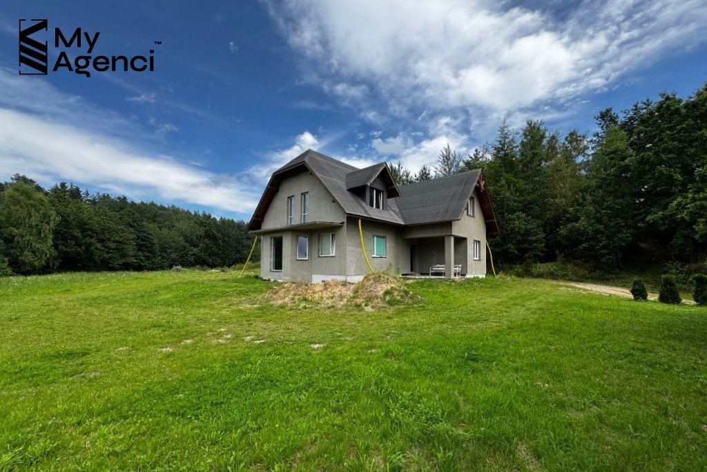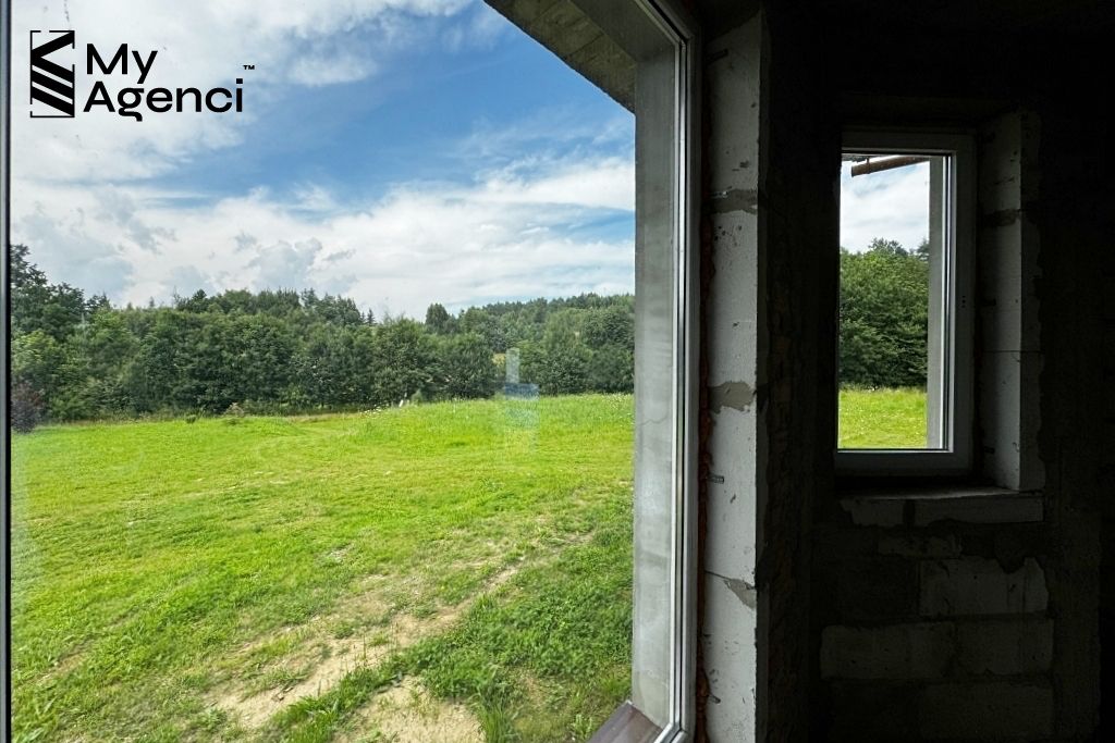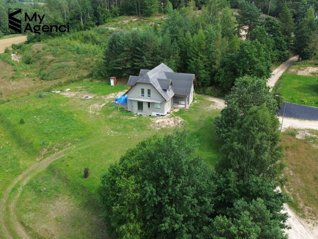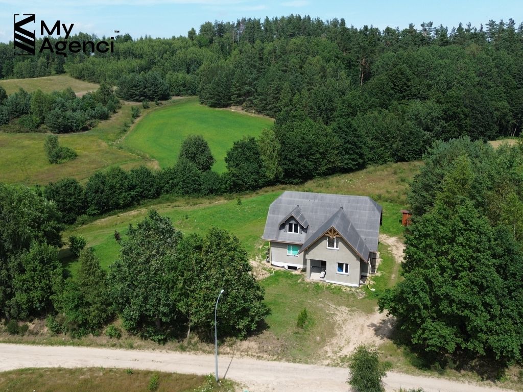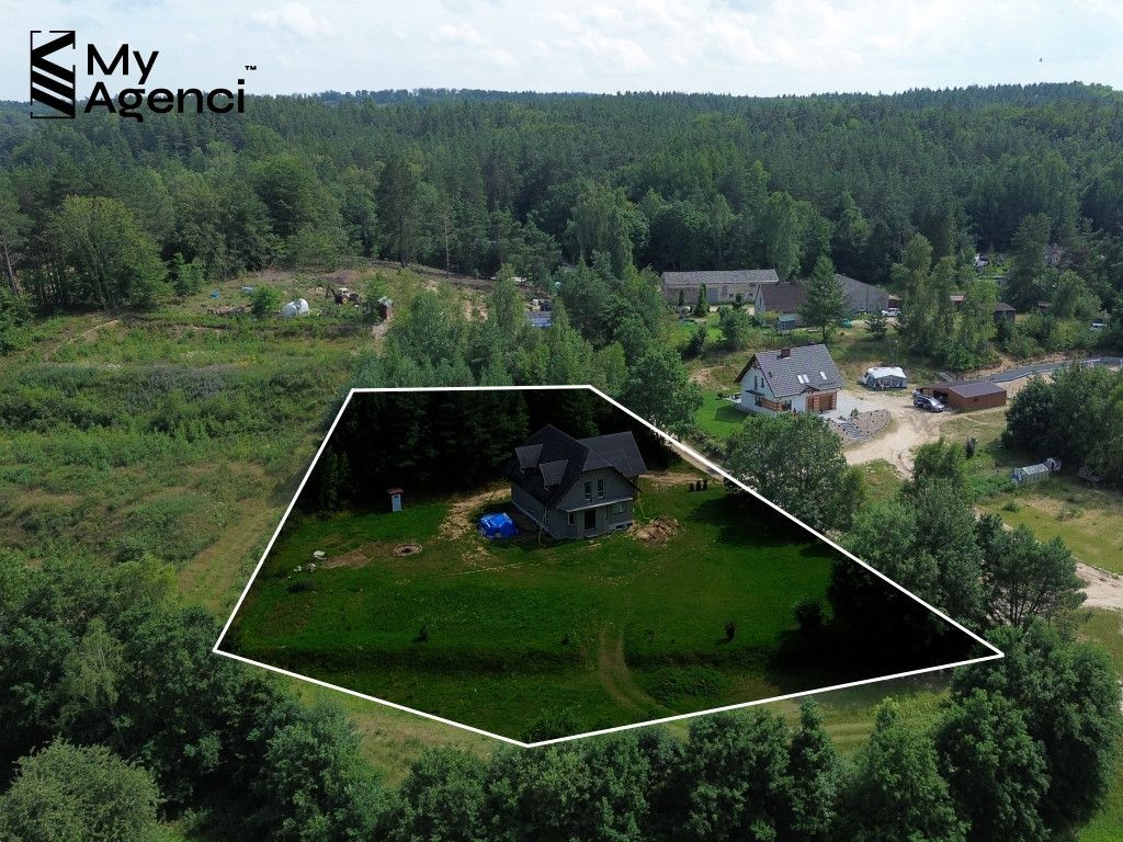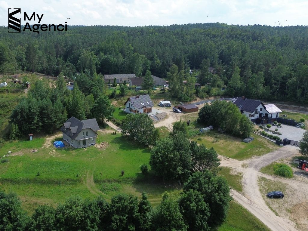 Działka jest pięknie położona wśród lasów i pól. Teren jest zróżnicowany, co dodaje nieruchomości uroku i unikalności. Dom usytuowany jest pomiędzy lasem (o pow. ok. 1 200 m2), na lekkim wzniesieniu, z dala od zabudowań, w bardzo cichej i spokojnej okolicy. Budynek ma bezpośredni dostęp do drogi publicznej, ul. Jagodowej. Jest możliwość wydzielenia z przedmiotowej działki terenu o powierzchni ok. 1000 m2/1200 m2 pod zabudowę jednorodzinną.
