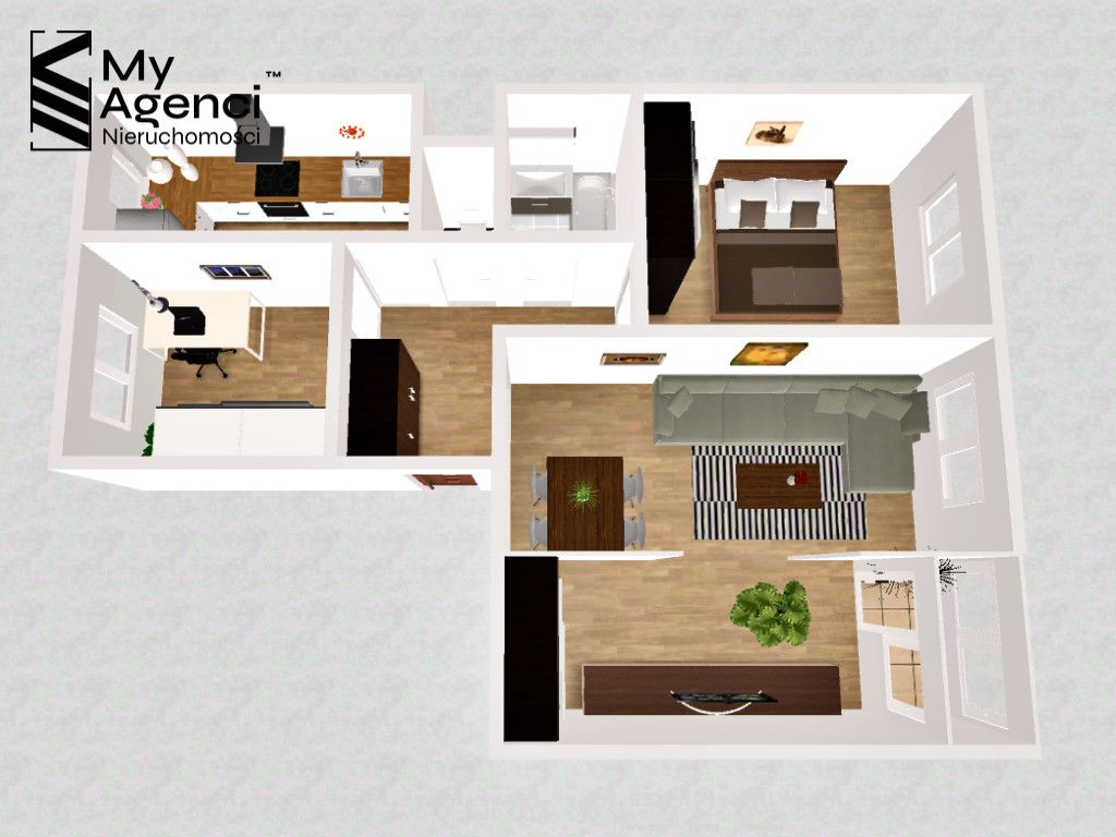 - pokoju dziennego (27 m2) z wyjściem na zamkniętąloggię (2 m2), - pokoju (9 m2), - pokoju (10 m2), - kuchni (7 m2), - łazienki (3 m2), - toalety (1 m2), - przedpokoju.