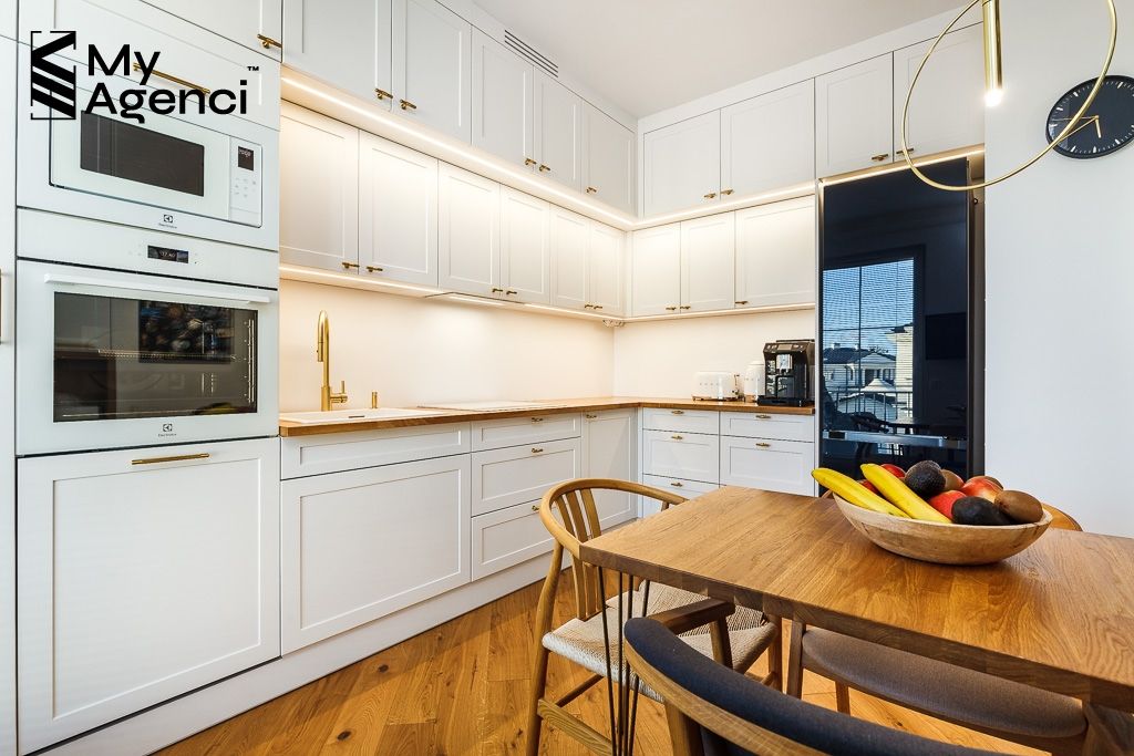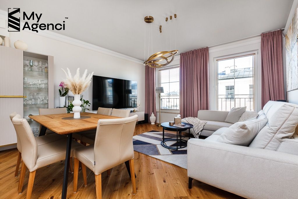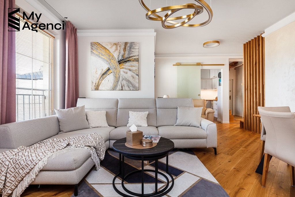 Apartament został wykończony pod własne potrzeby mieszkaniowe, w bardzo wysokim standardzie. Zabudowa kuchni oraz szafy w garderobie zostały zaprojektowane i wykonane na wymiar przez stolarza, przy zastosowaniu wysokiej klasy akcesoriów. Dla wygody mieszkańców zostały urządzone dwie łazienki (jedna z prysznicem druga z wanną i prysznicem). Podłoga drewniana, dębowa, podobnie jak schody, prowadzące do sypialni na poddaszu. Drzwi wewnętrzne bezprzylgowe, z potrójnymi zawiasami i magnetycznym domykiem. Okna trzyszybowe, klimatyzacja. Mieszkanie użytkowane jest od roku, z uwagi na zamknięte i strzeżone osiedle świetnie sprawdzi się jako apartament typu "second home".