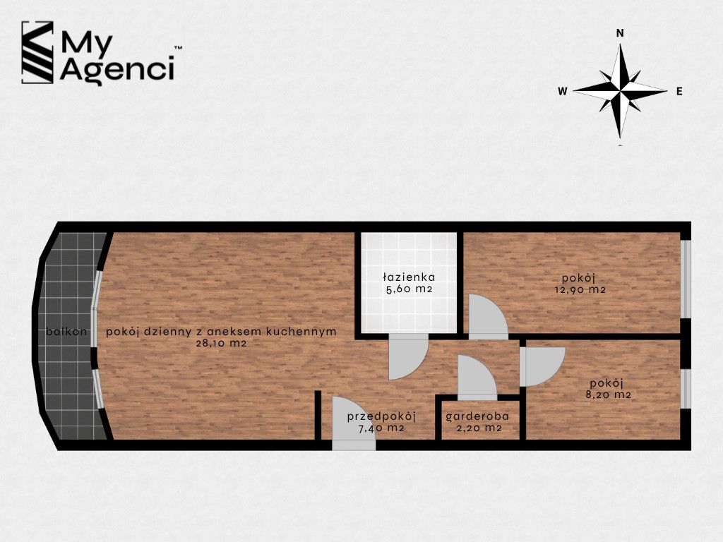 - salonu z aneksem kuchennym (28,10 m2) z wyjściem na balkon (ok. 7 m2) - pokoju (12,90 m2) - pokoju (8,20 m2) - łazienki (5,60 m2) - garderoby (2,20 m2) - przedpokoju (7,40 m2).