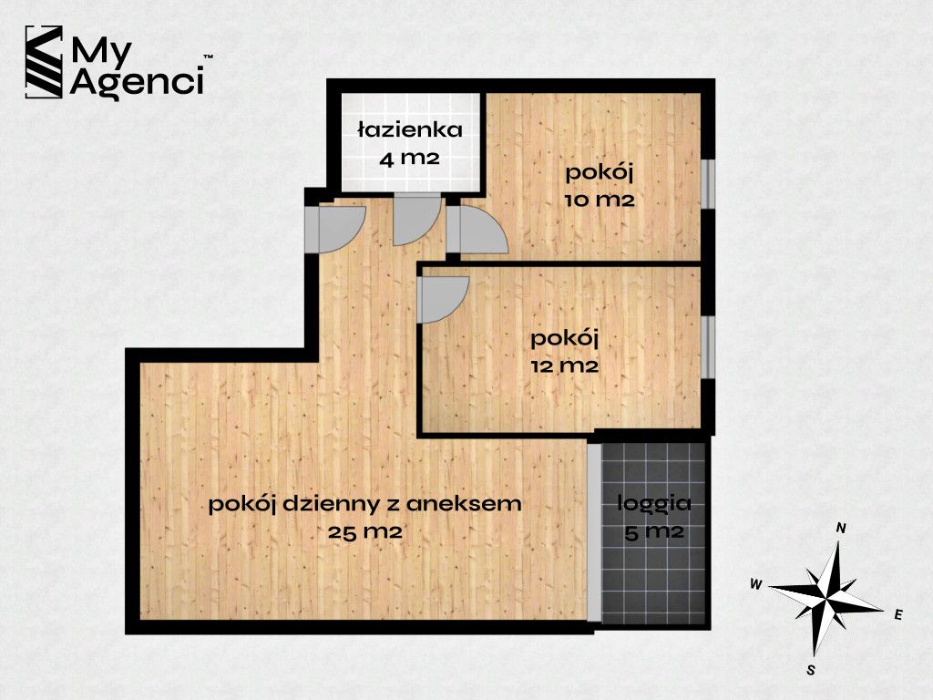 - pokoju dziennego z aneksem kuchennym (ok. 25 m2) z wyjściem na słoneczną loggię (ok. 5 m2) - pokoju (ok. 12 m2) - pokoju (ok. 10 m2) - łazienki (ok. 4 m2) - i przedpokoju.