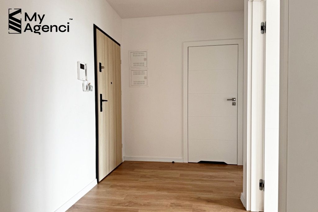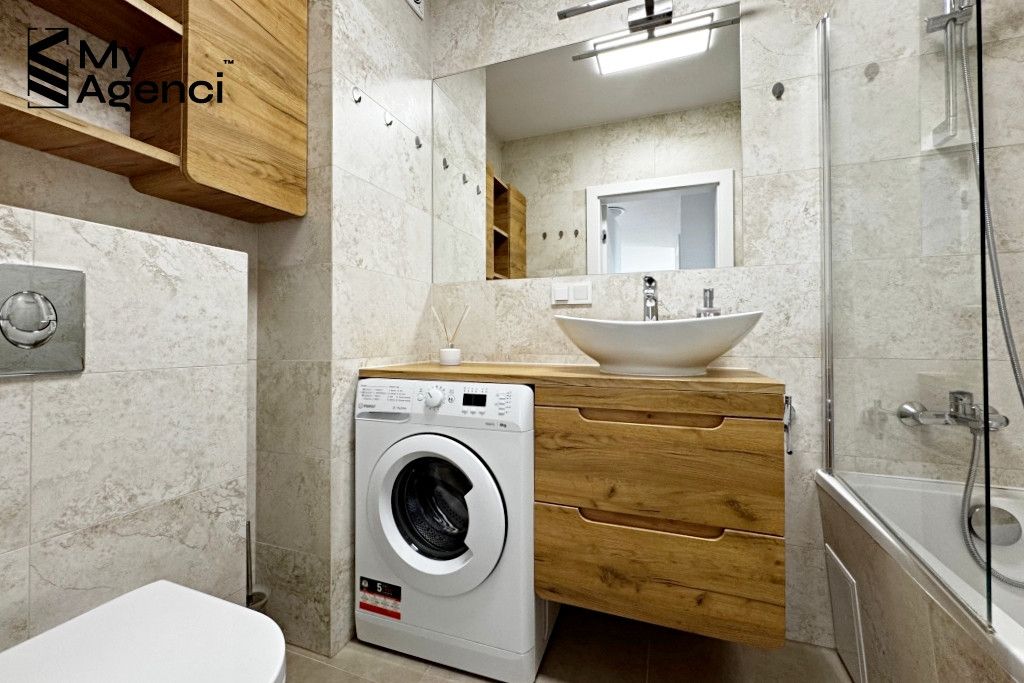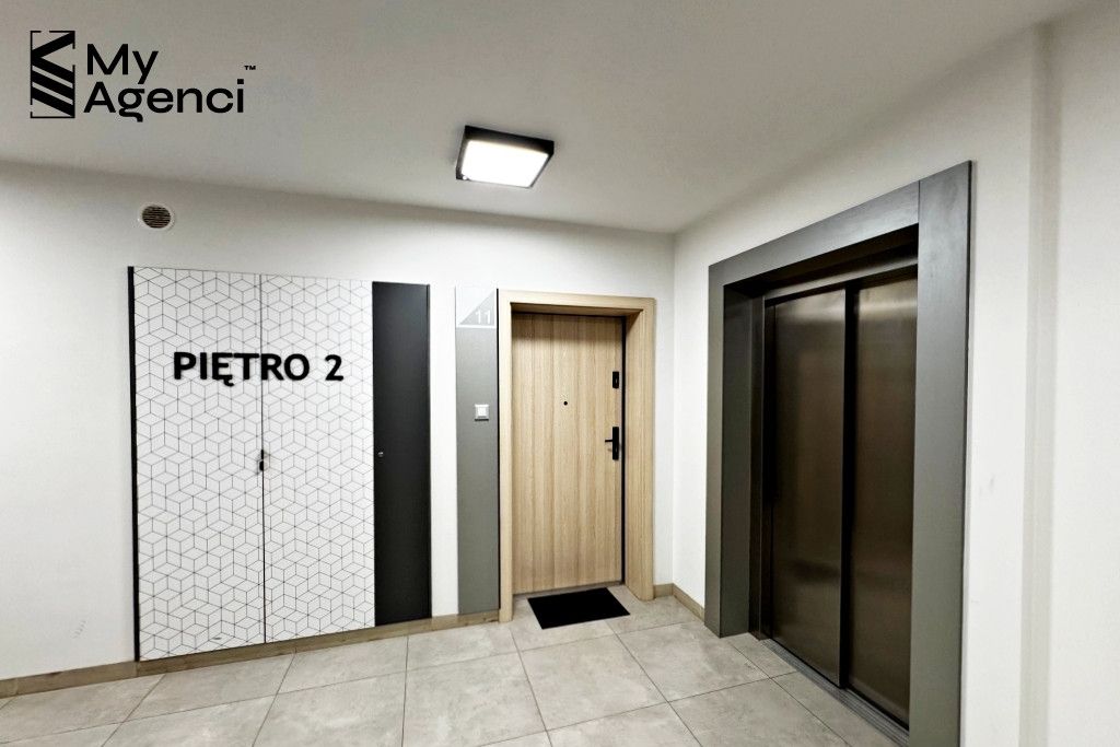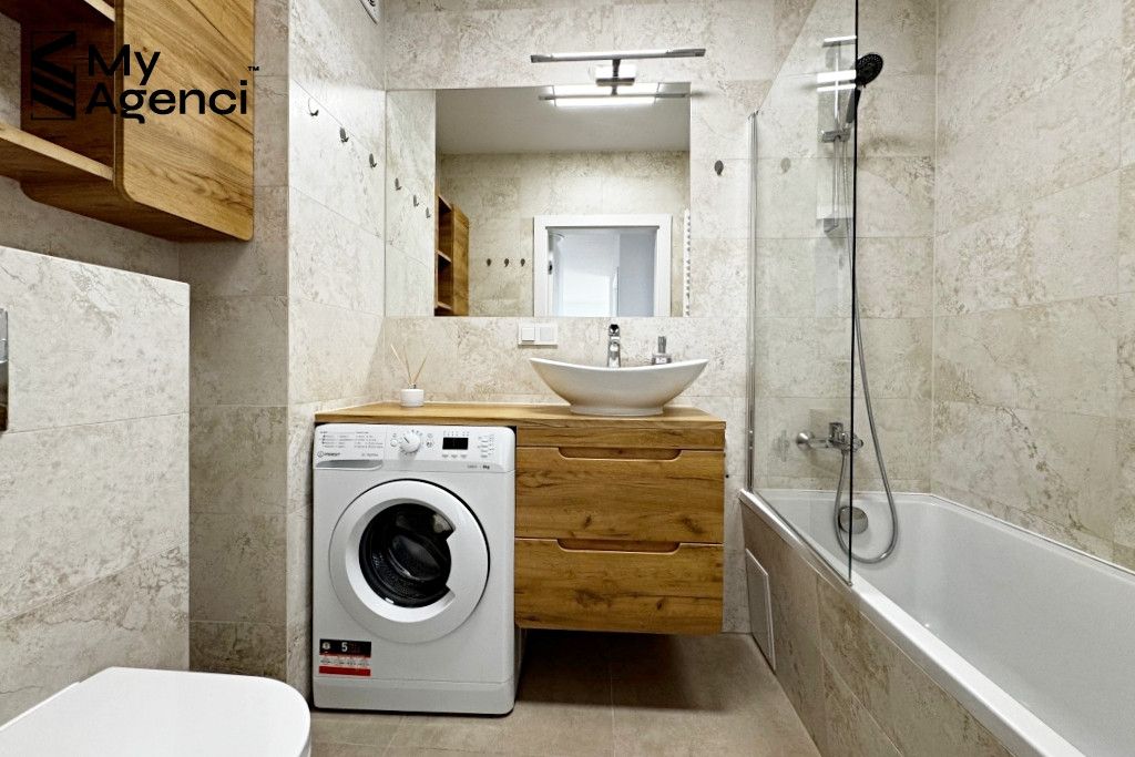 Mieszkanie zostało zakupione w stanie deweloperskim i wykończone w 2023 roku. Na ścianach położono gładzie i farbę, w łazienkach i kuchni glazurę; na podłogach panele i terakotę. Okna PCV, parapety z konglomeratu. Kuchnia wyposażona jest w meble w zabudowie wraz ze sprzętem AGD (lodówka, płyta, piekarnik, zmywarka, pochłaniacz). Łazienka wyposażona jest m.in. w wannę z prysznicem, szafki oraz pralkę. Mieszkanie jest utrzymane w bardzo dobrym stanie, meble i sprzęty pozostają na wyposażeniu. Termin wydania nieruchomości po akcie i zapłacie całej ceny, jednak nie szybciej niż 31.08.2026 r.