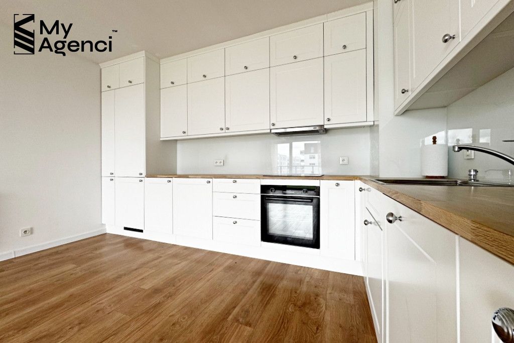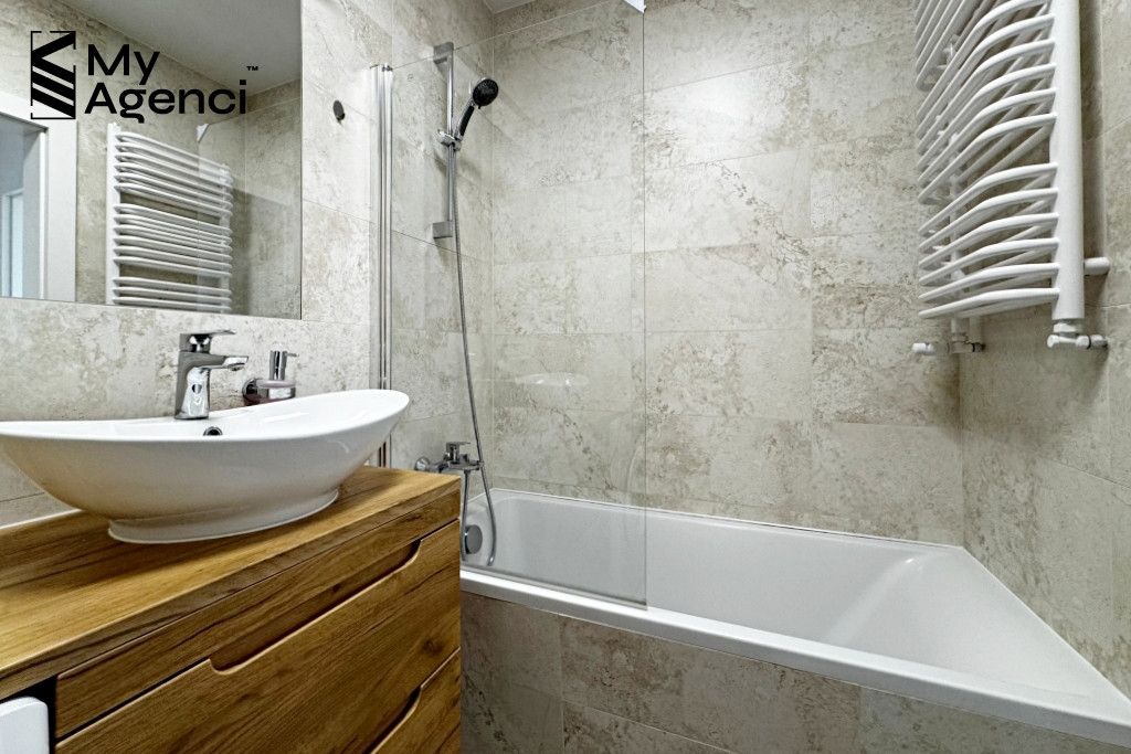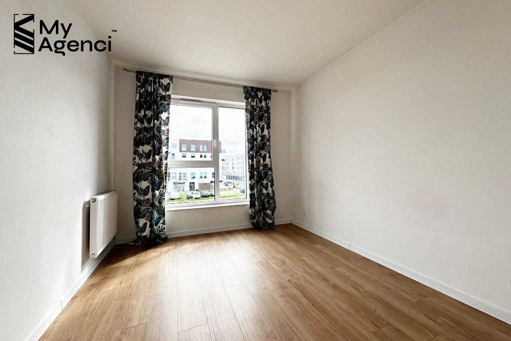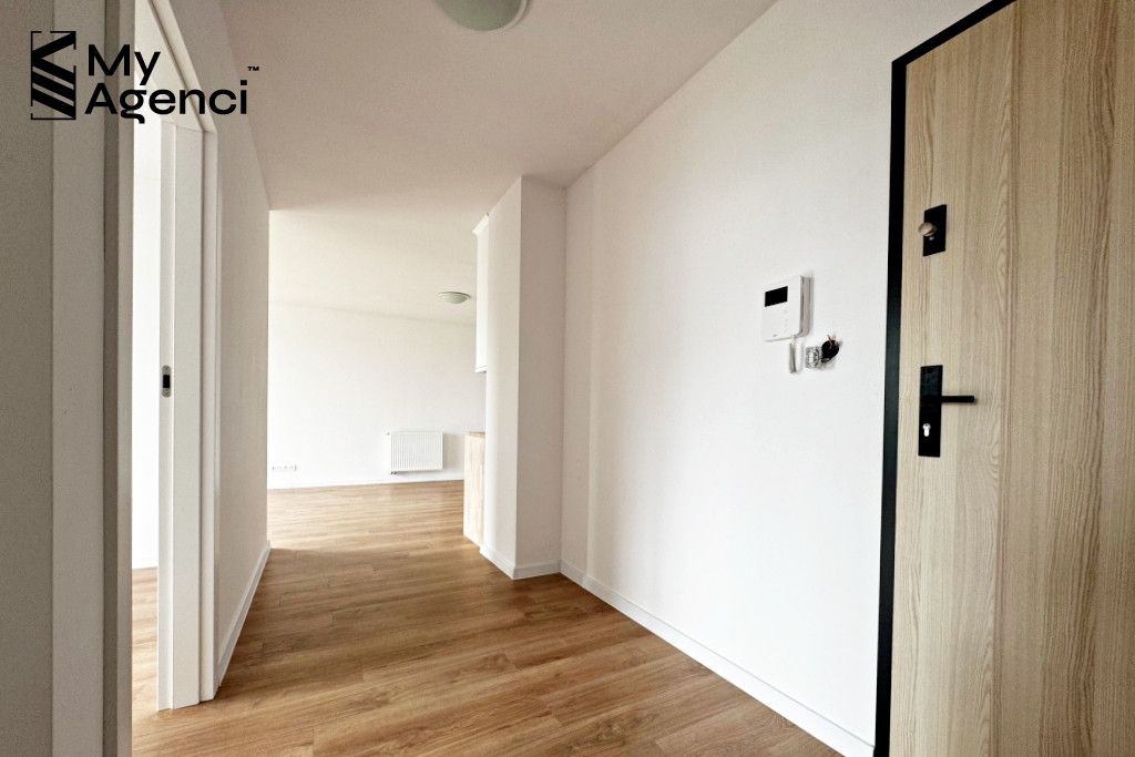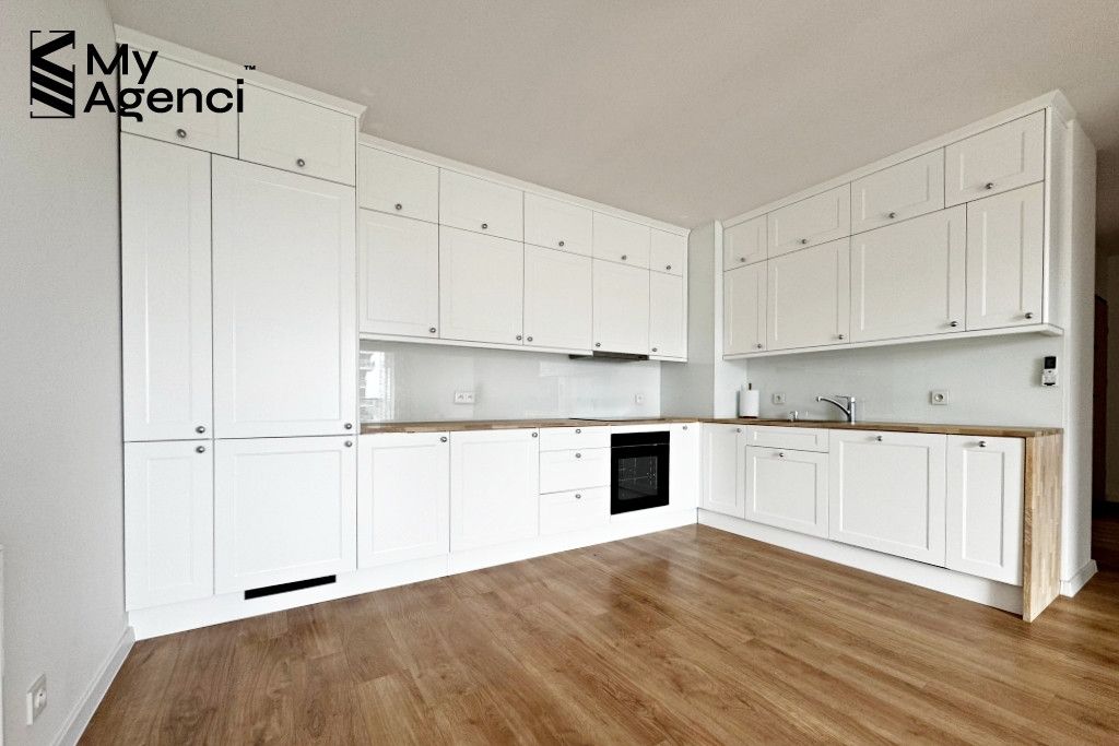 Mieszkanie zostało zakupione w stanie deweloperskim i wykończone w 2023 roku. Na ścianach położono gładzie i farbę, w łazienkach i kuchni glazurę; na podłogach panele i terakotę. Okna PCV, parapety z konglomeratu. Kuchnia wyposażona jest w meble w zabudowie wraz ze sprzętem AGD (lodówka, płyta, piekarnik, zmywarka, pochłaniacz). Łazienka wyposażona jest m.in. w wannę z prysznicem, szafki oraz pralkę. Mieszkanie jest utrzymane w bardzo dobrym stanie, meble i sprzęty pozostają na wyposażeniu. Termin wydania nieruchomości po akcie i zapłacie całej ceny, jednak nie szybciej niż 31.08.2026 r.