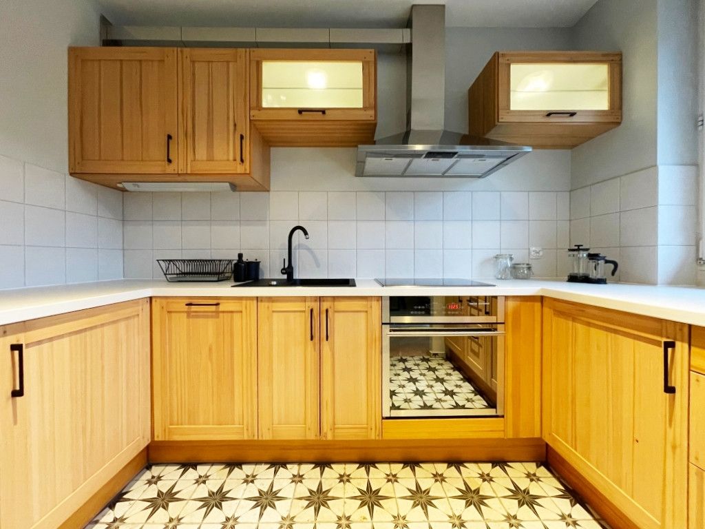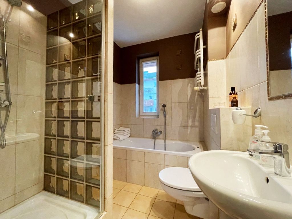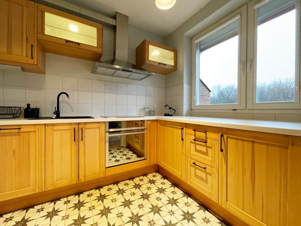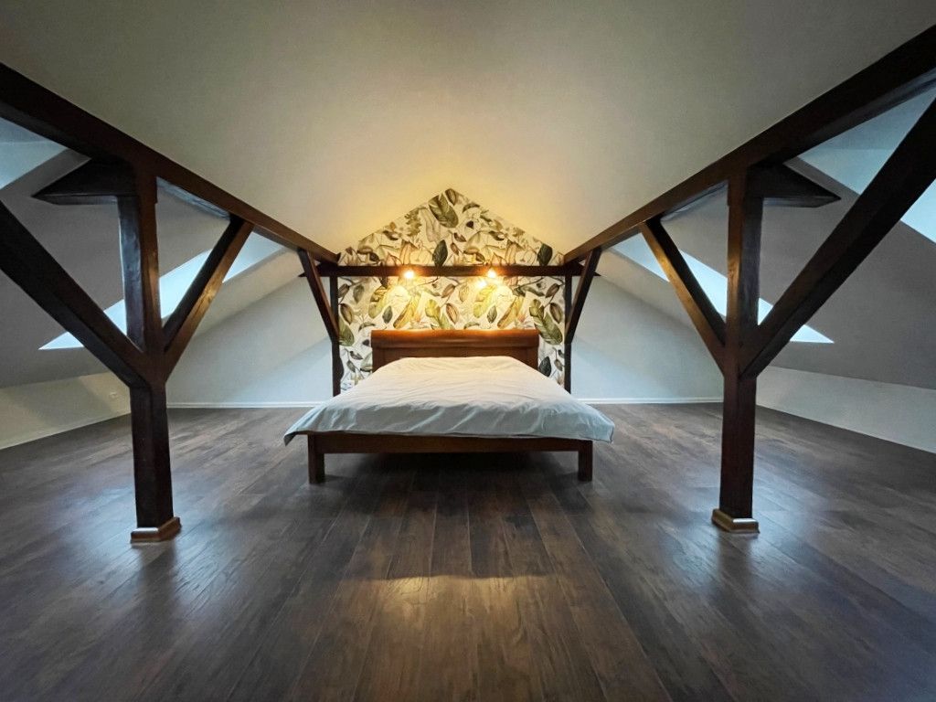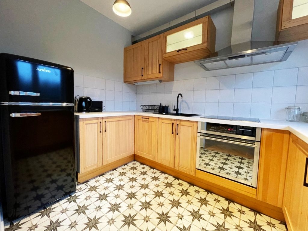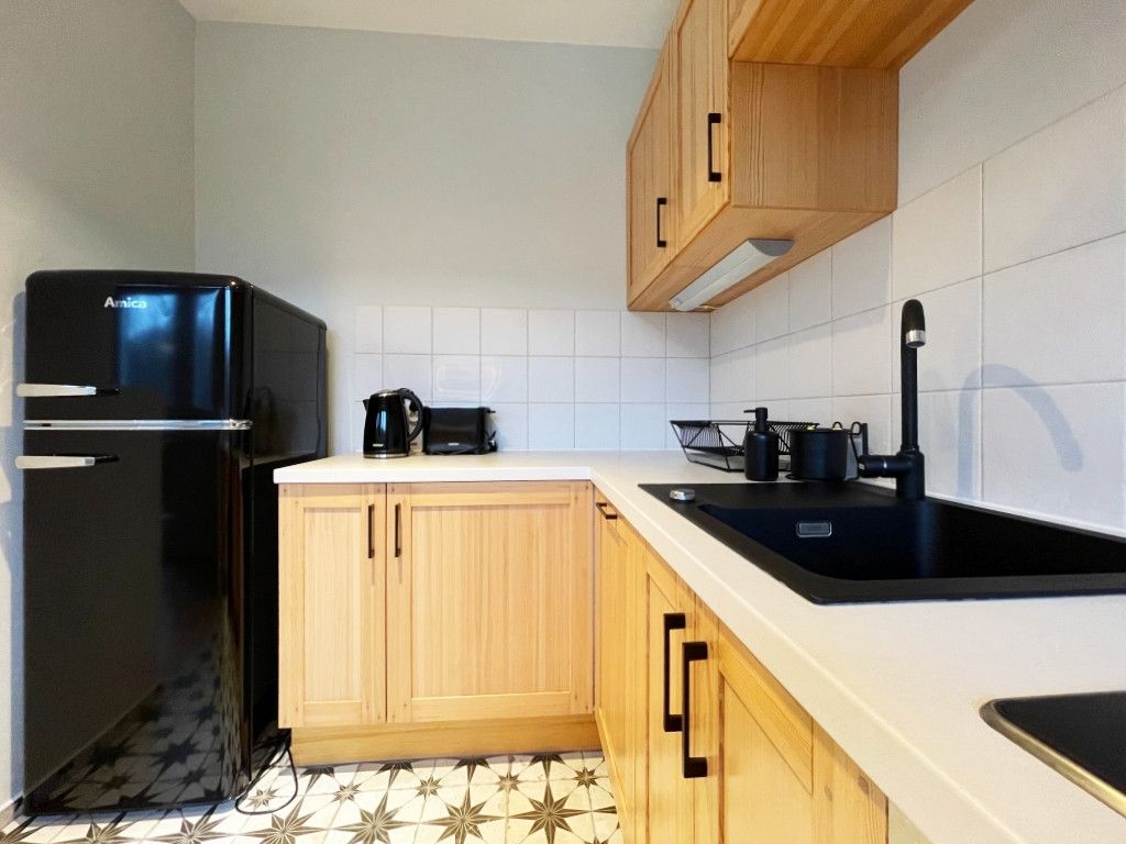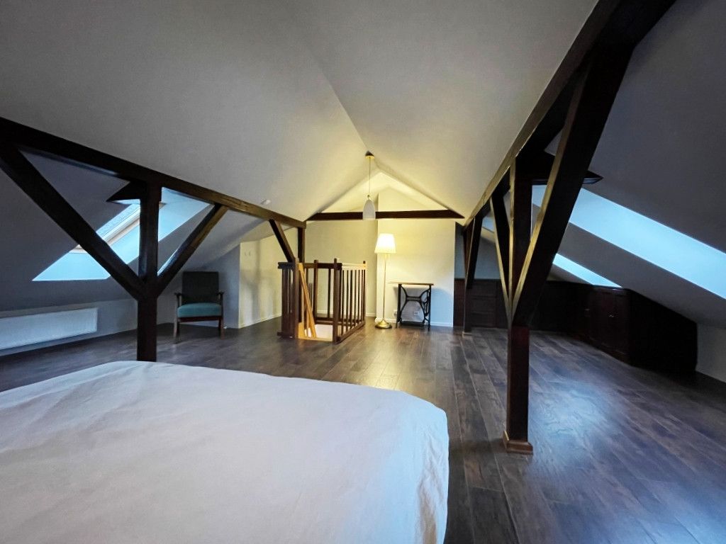 Mieszkanie jest w pełni wyposażone i gotowe do wydania po zawarciu umowy. Kuchnia posiada meble w zabudowie wraz ze sprzętami AGD (lodówko-zamrażalką, płytą, piekarnikiem, pochłaniaczem, zmywarką, czajnikiem i innym drobnym wyposażeniem). W salonie znajduje się stół i krzesła, w sypialni regał i szafa w zabudowie, na poddaszu łóżko i narożna komoda, łazienka z wanną i kabiną prysznicową. Ponadto na wyposażeniu pozostaje m.in. deska do prasowania, żelazko czy suszarka. Wszystkie pomieszczenia są funkcjonalne, przestronne i słoneczne.