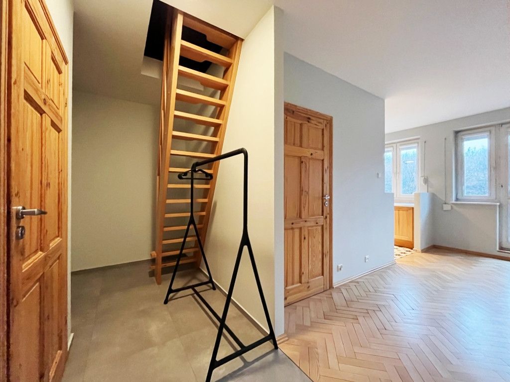 - pokoju dziennego z aneksem kuchennym (ok. 27 m2) z wyjściem na balkon - pokoju (ok. 12 m2) - łazienki (ok. 5 m2) - pomieszczenia gospodarczego (ok. 2 m2) - i poddasza, stanowiącego otwartą przestrzeń do własnej aranżacji.